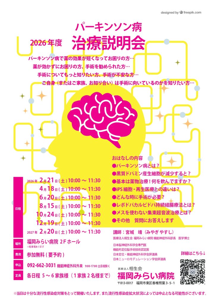 福岡みらい病院では、パーキンソン病を中心としてジストニアなどの病気や治療法について正しく理解していただけるよう、患者さんやご家族、医療スタッフを対象に、機能神経外科 宮城靖 医師による定期的な説明会を福岡みらい病院ホールで行っております。関心をお持ちの方はどなたでもご参加いただけます(予約制)。