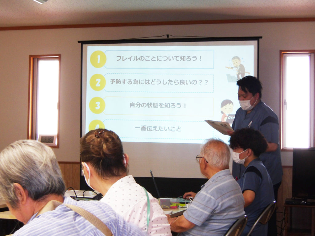 今回のテーマは「フレイル」。当院の山見坂理学療法士と吉田作業療法士がフレイル予防のお話や座ったままできる体操などをご紹介させていただきました。